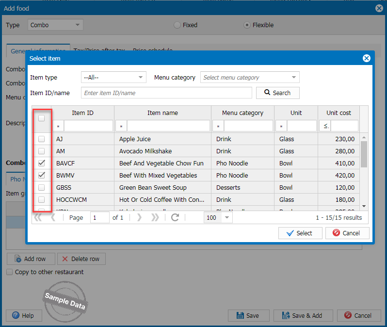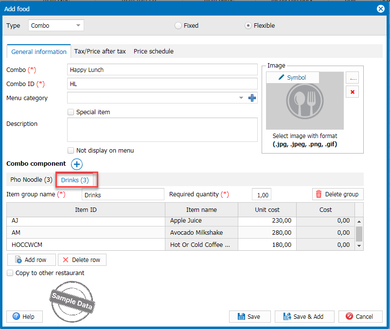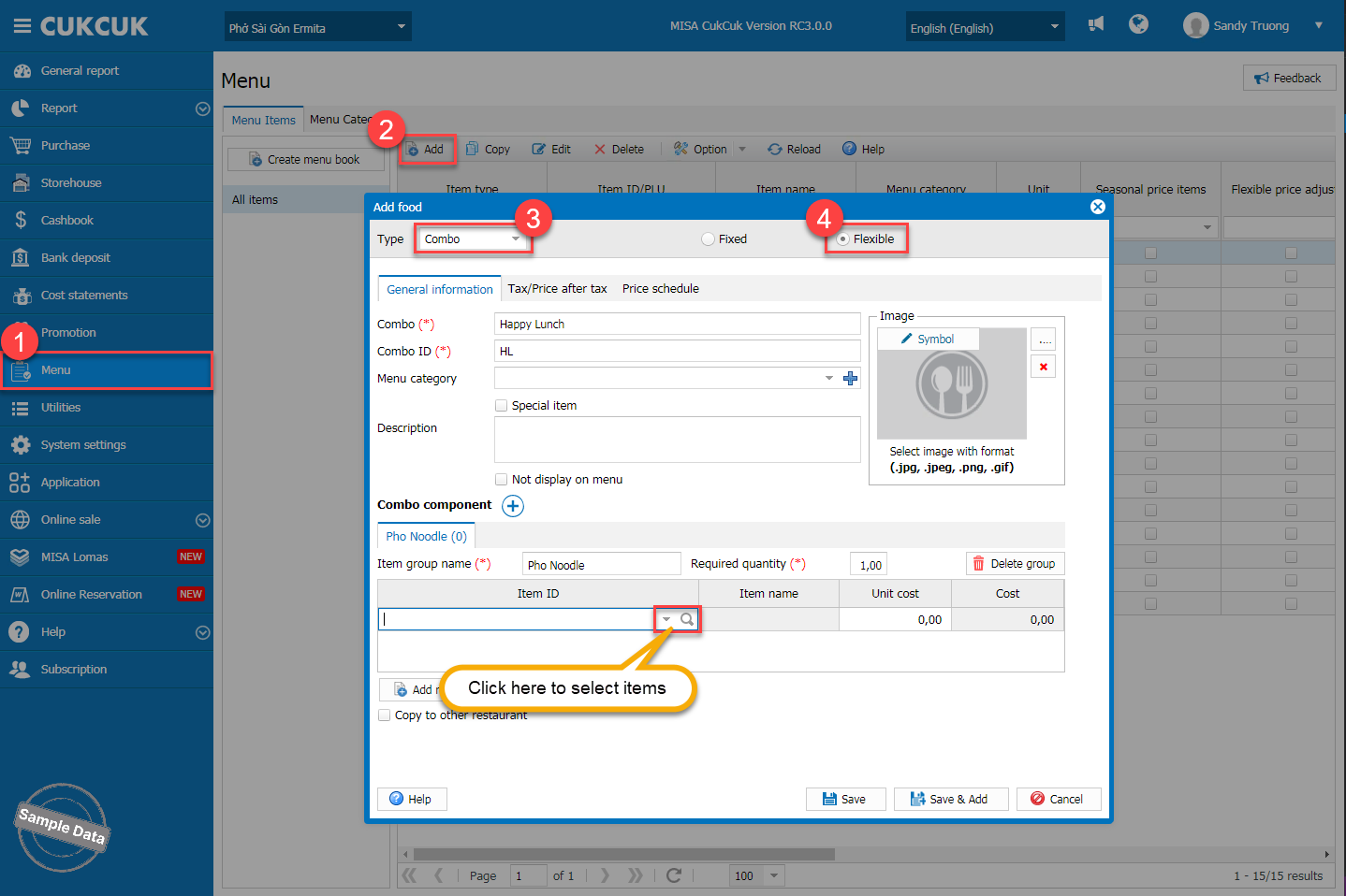 On the management page, go to Menu. Click Add, select type as Combo and Flexible. Enter combo information. Set the required quantity for each combo component. Click search icon to add items.