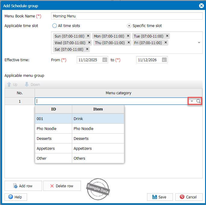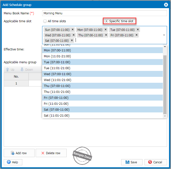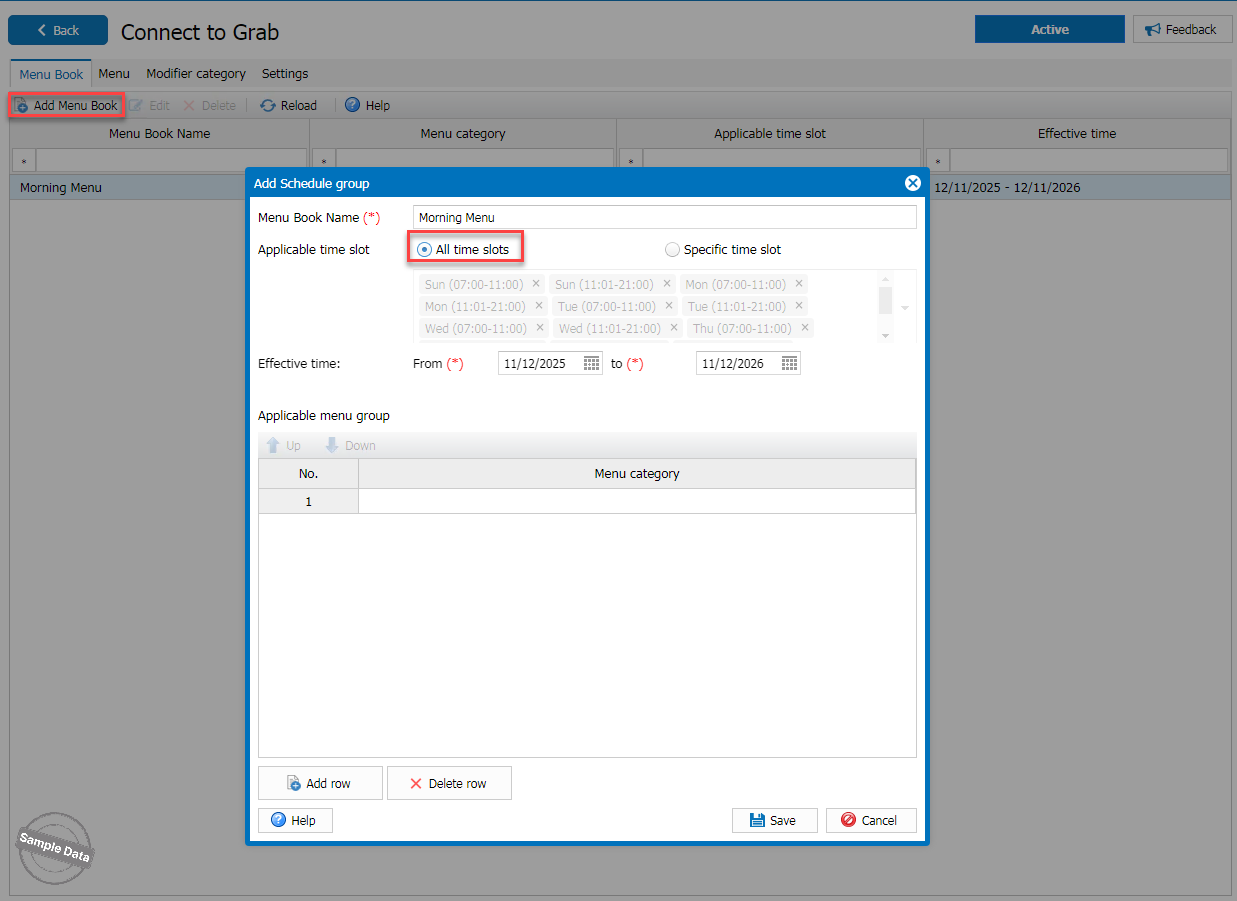 Click Add Menu Book. Enter a book name. You can select All time slots.