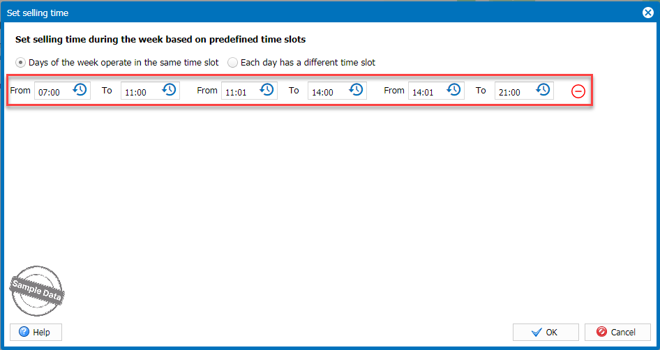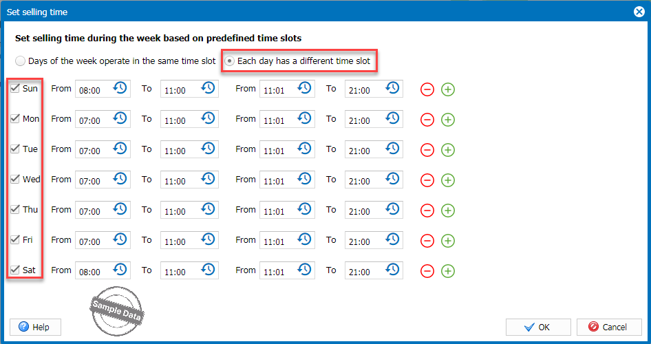 If the restaurant’s business hours vary for different time slots each day, check Each day has a different time slot. Check the days the restaurant operates and add time slots.
