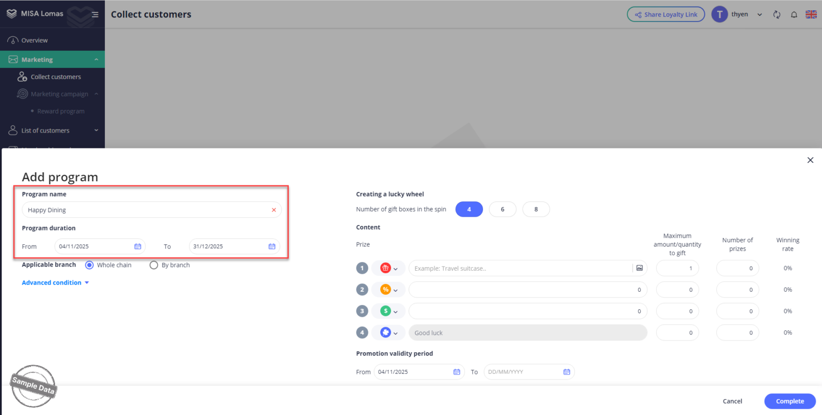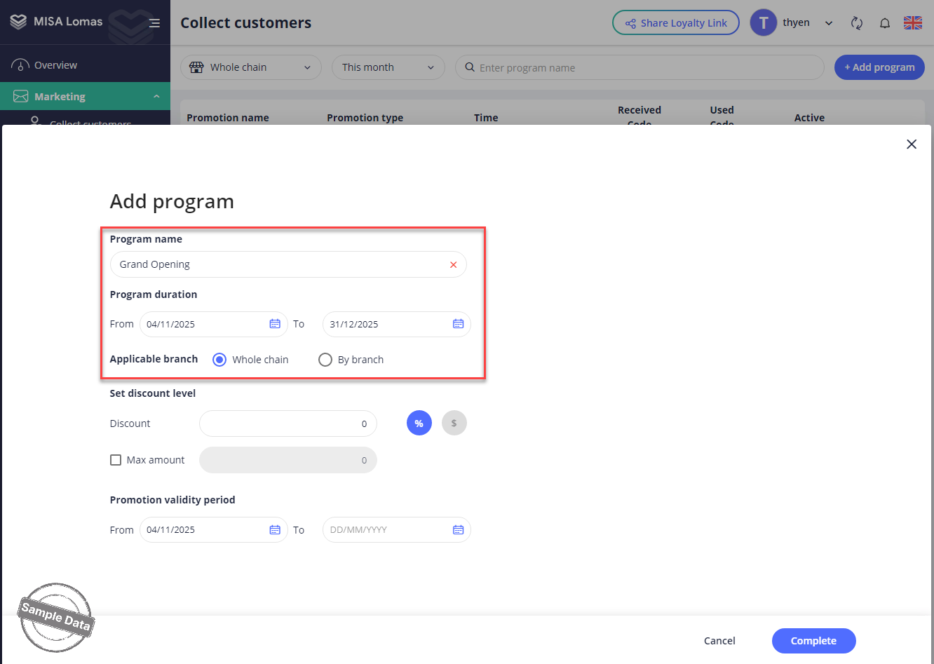 Fill in Program name, select Program duration. If this is a restaurant chain, select Applicable branch: Whole chain or By branch.