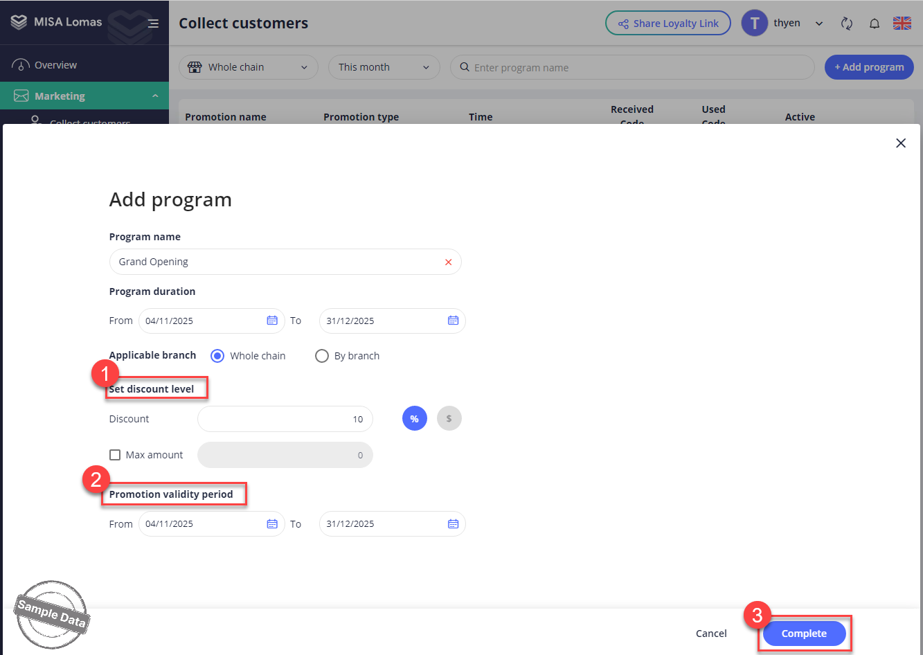 You can offer discount by percentage or amount and set up validity period. And then click Complete.