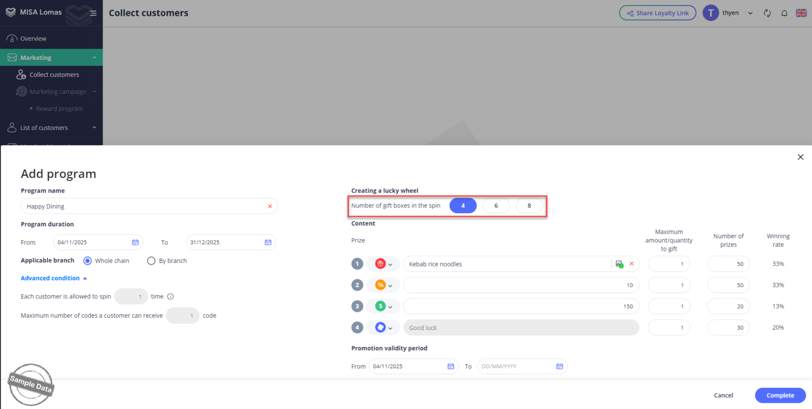 Select number of gift boxes in the spin. Customize the prizes. Click Complete.