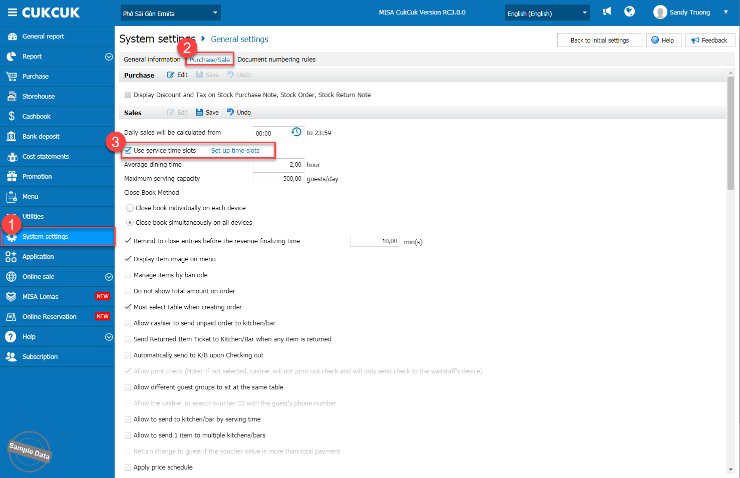 On the management page, go to System settings/General settings. On Purchase/Sale tab, click Edit on Sales part and check Use service time slot.