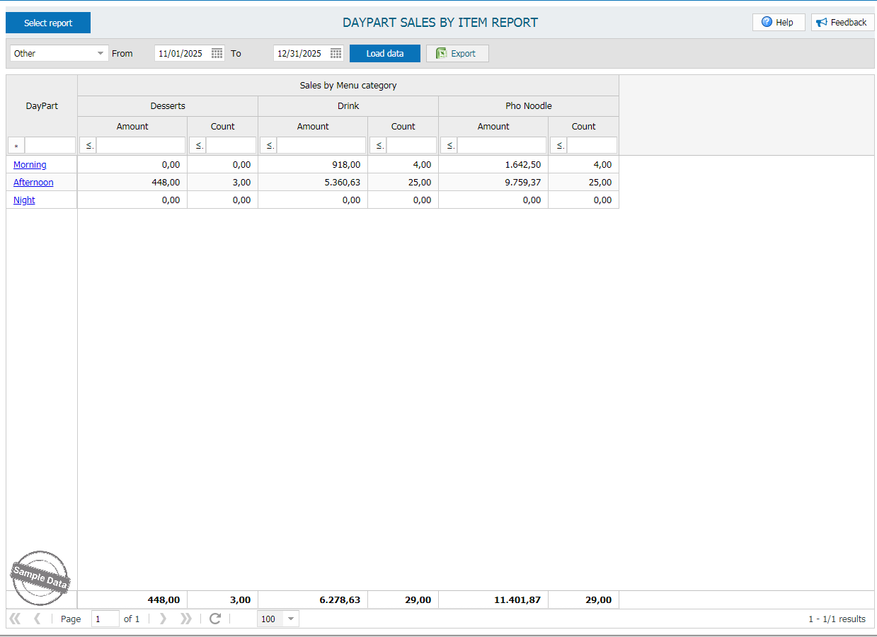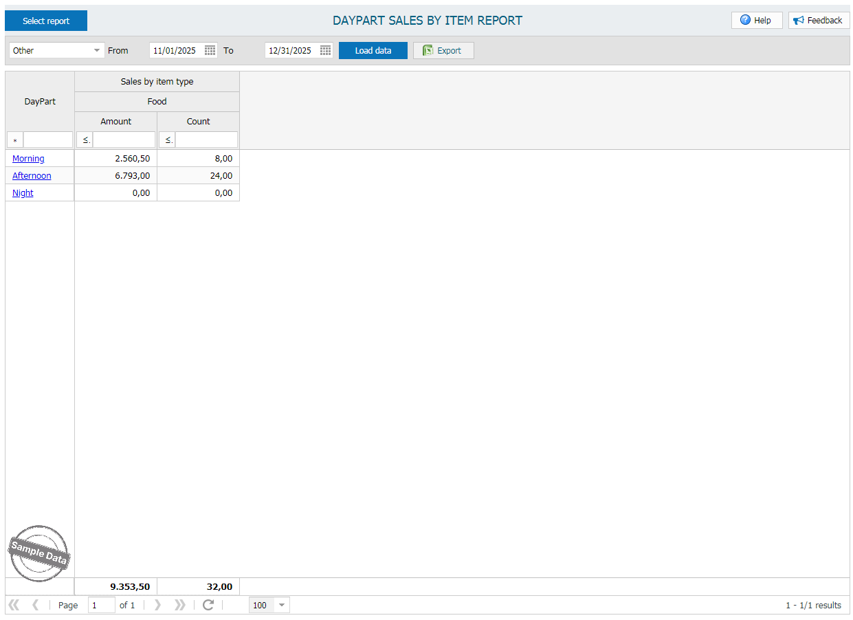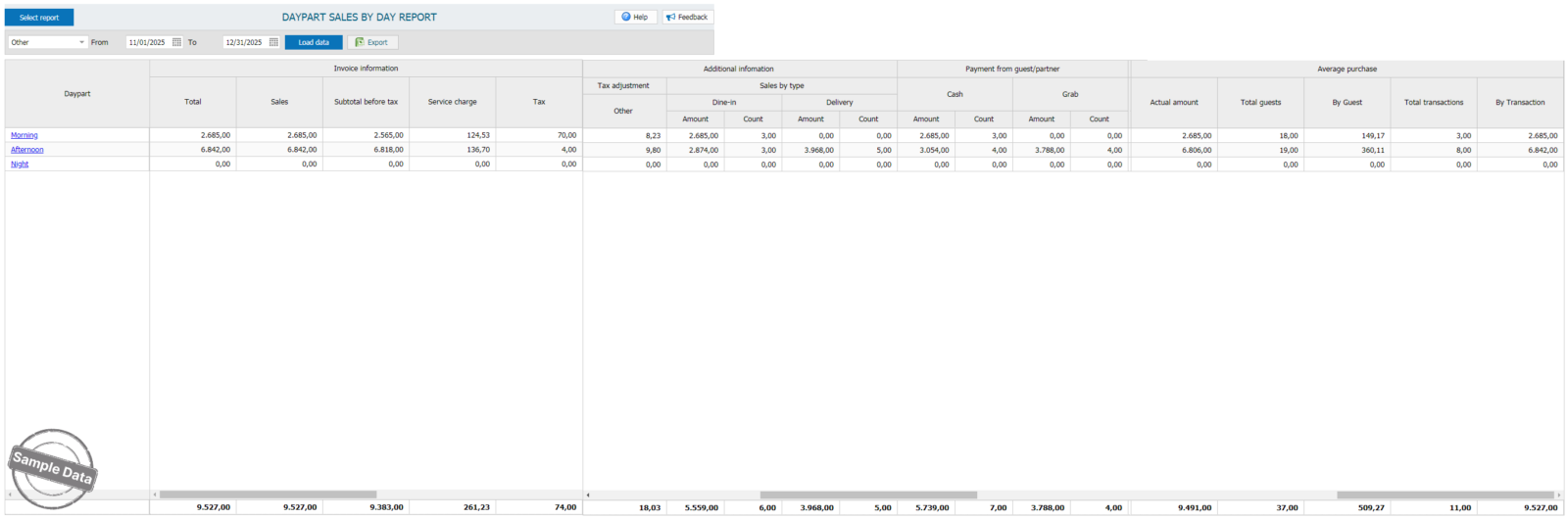 Go to Report/Sales. Click Select report and Daypart sales by day report.