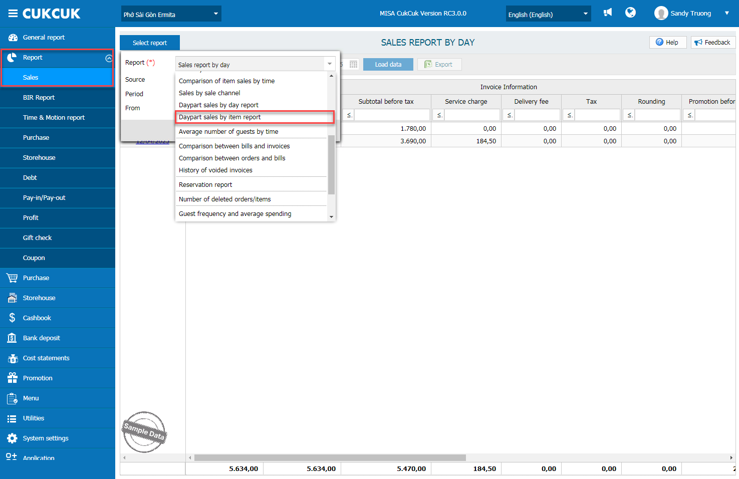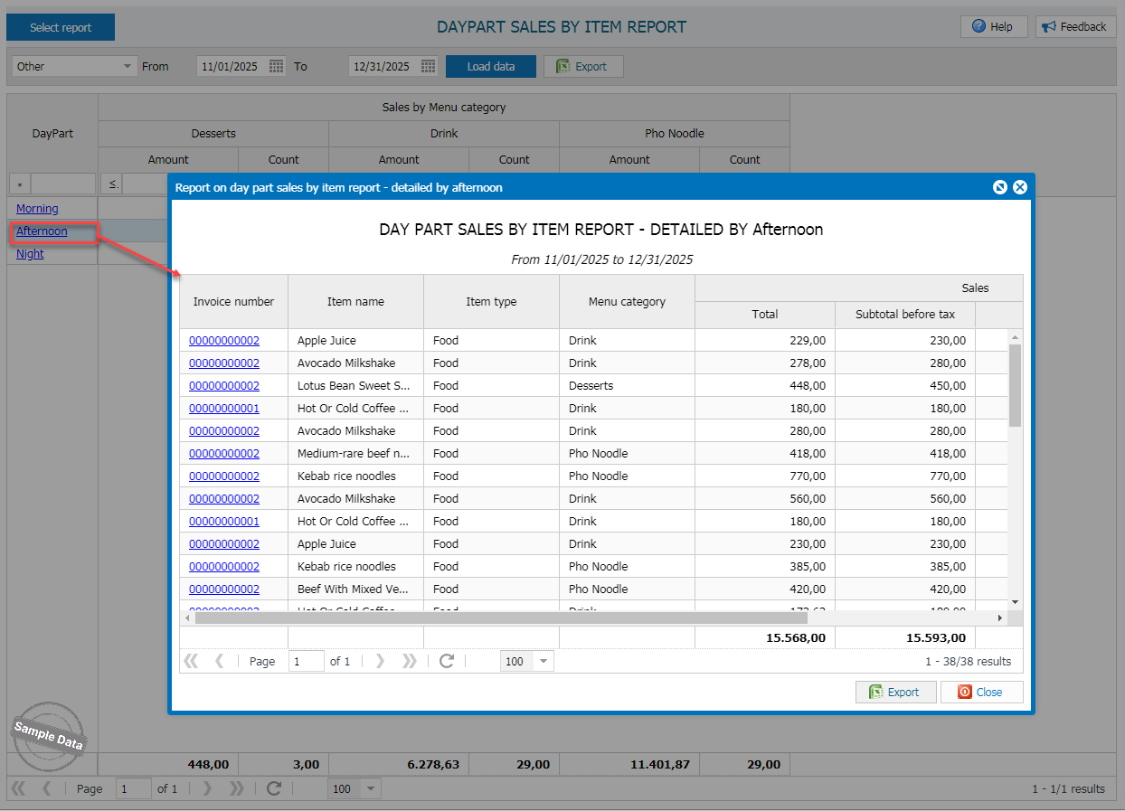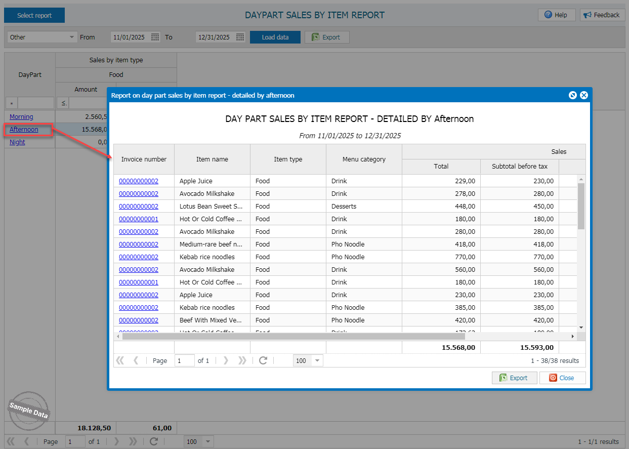 Go to Report/Sales. Click Select report and Daypart sales by item report.