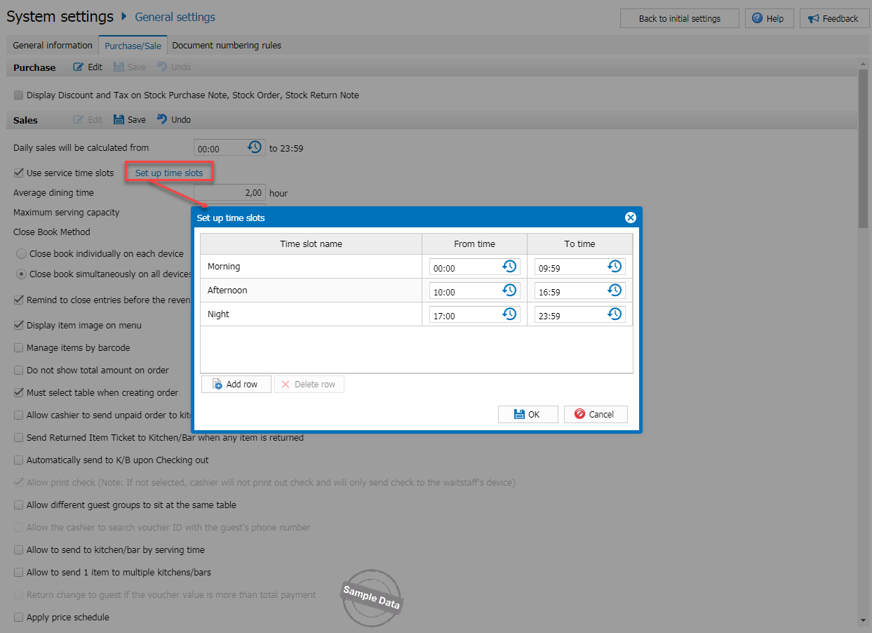 After clicking Set up time slots, set up time slots at the restaurant. And then click OK.