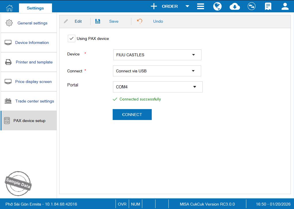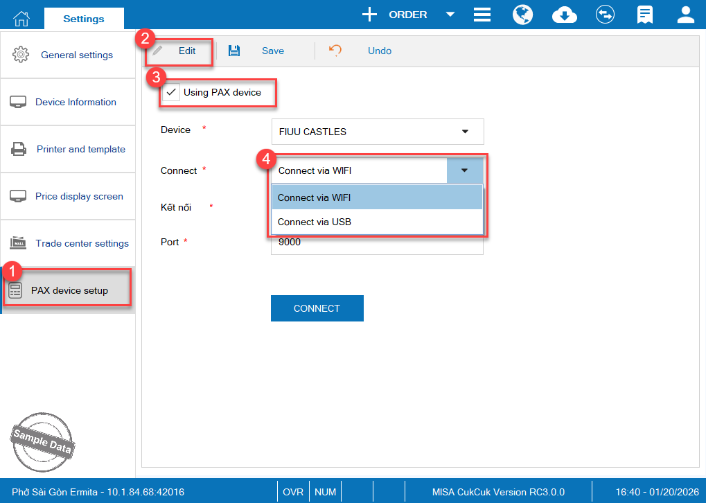 On PAX device setup, click Edit and check Using PAX device. You can connect via Wi-fi or via USB.