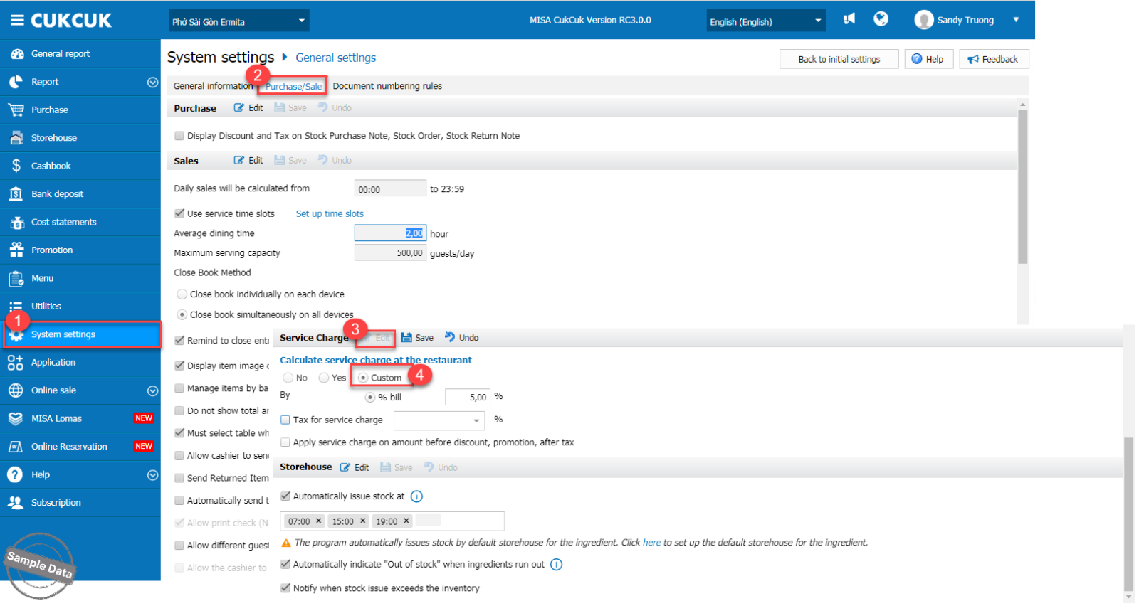 On the management page, go to System settings/General settings. Scroll down to Service charge tab, check Yes if you always want to collect service charge and check Custom if you want to allow to change the amount of service charge or not collect service charge. Then, click Save.