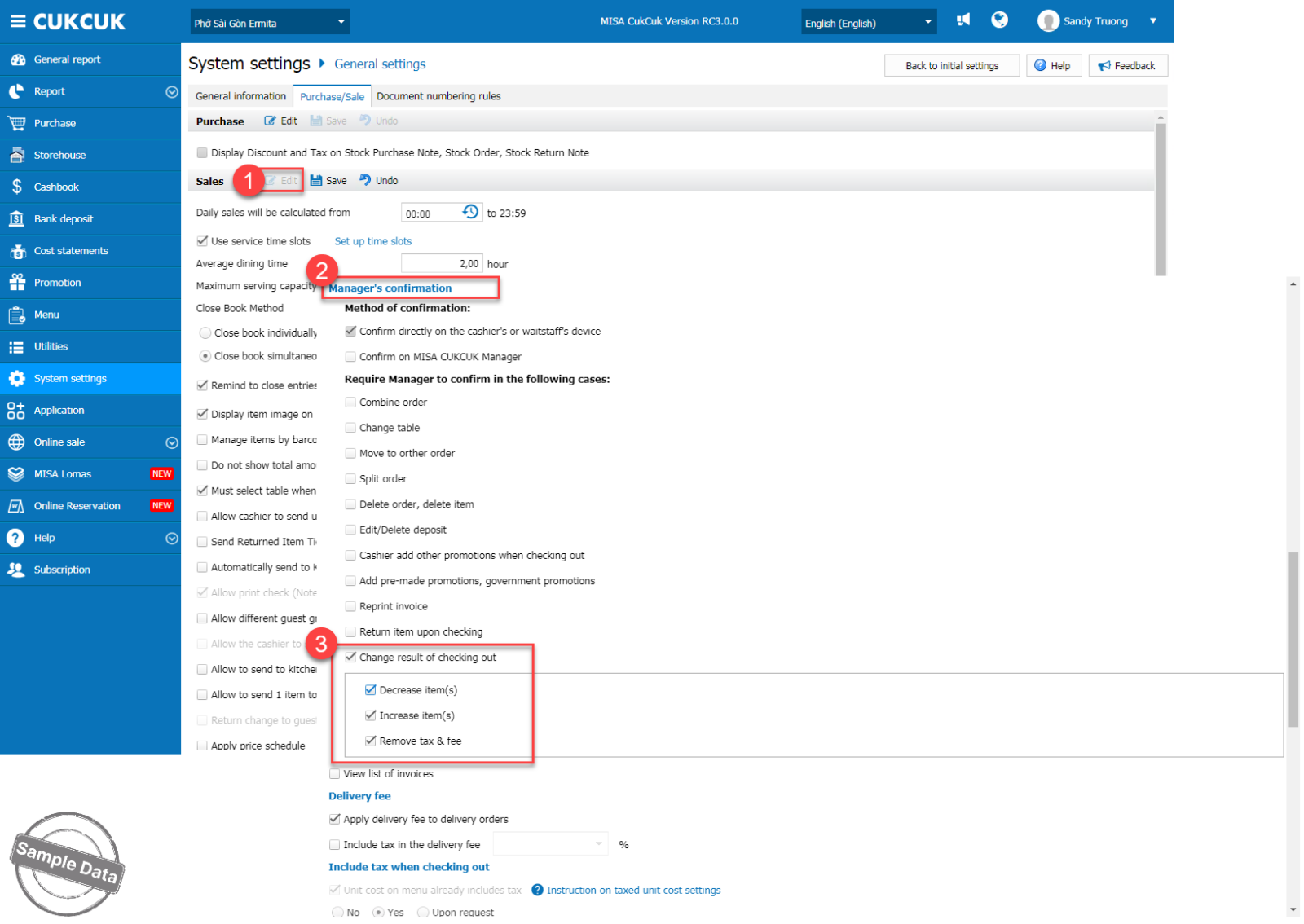 To control when and by whom this charge is edited or removed, on Sales tab, click Edit and scroll down to Manager’s confirmation. Check Change result of checking out and check applicable actions.