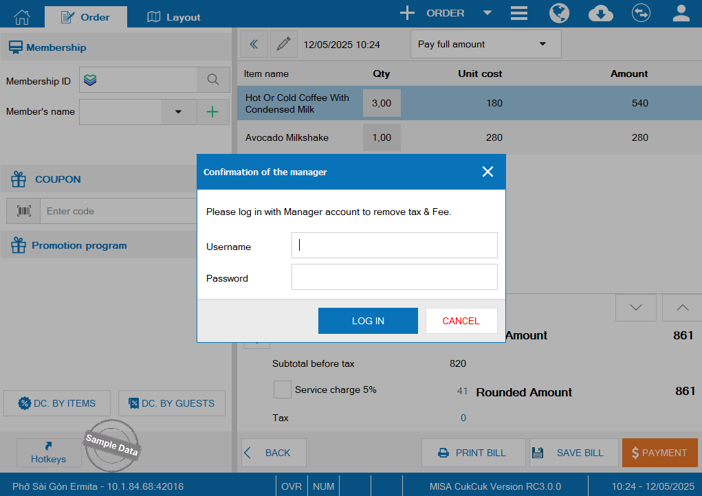 When the cashier chooses not to collect the service charge, the system will display a window requiring manager confirmation.
