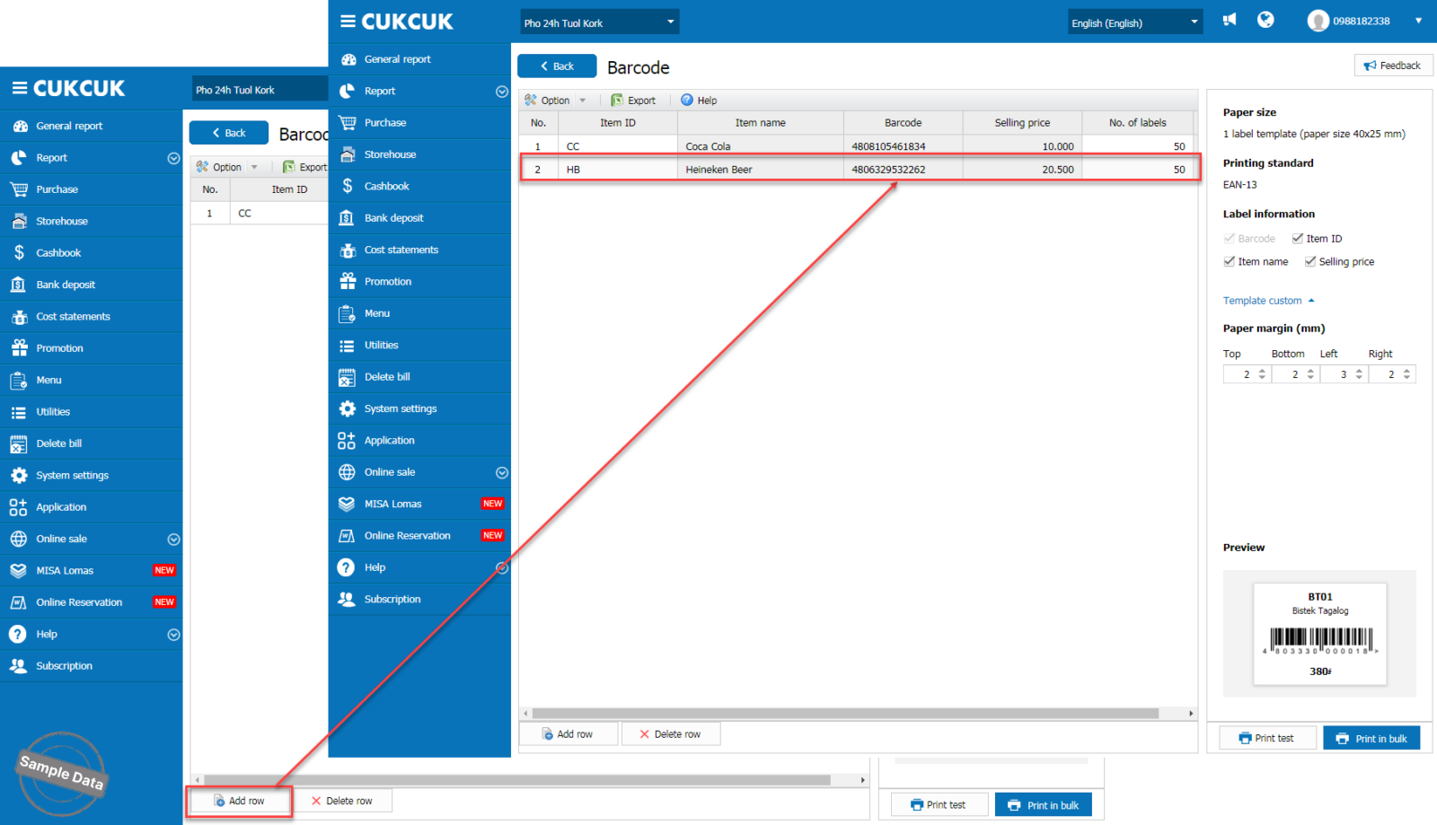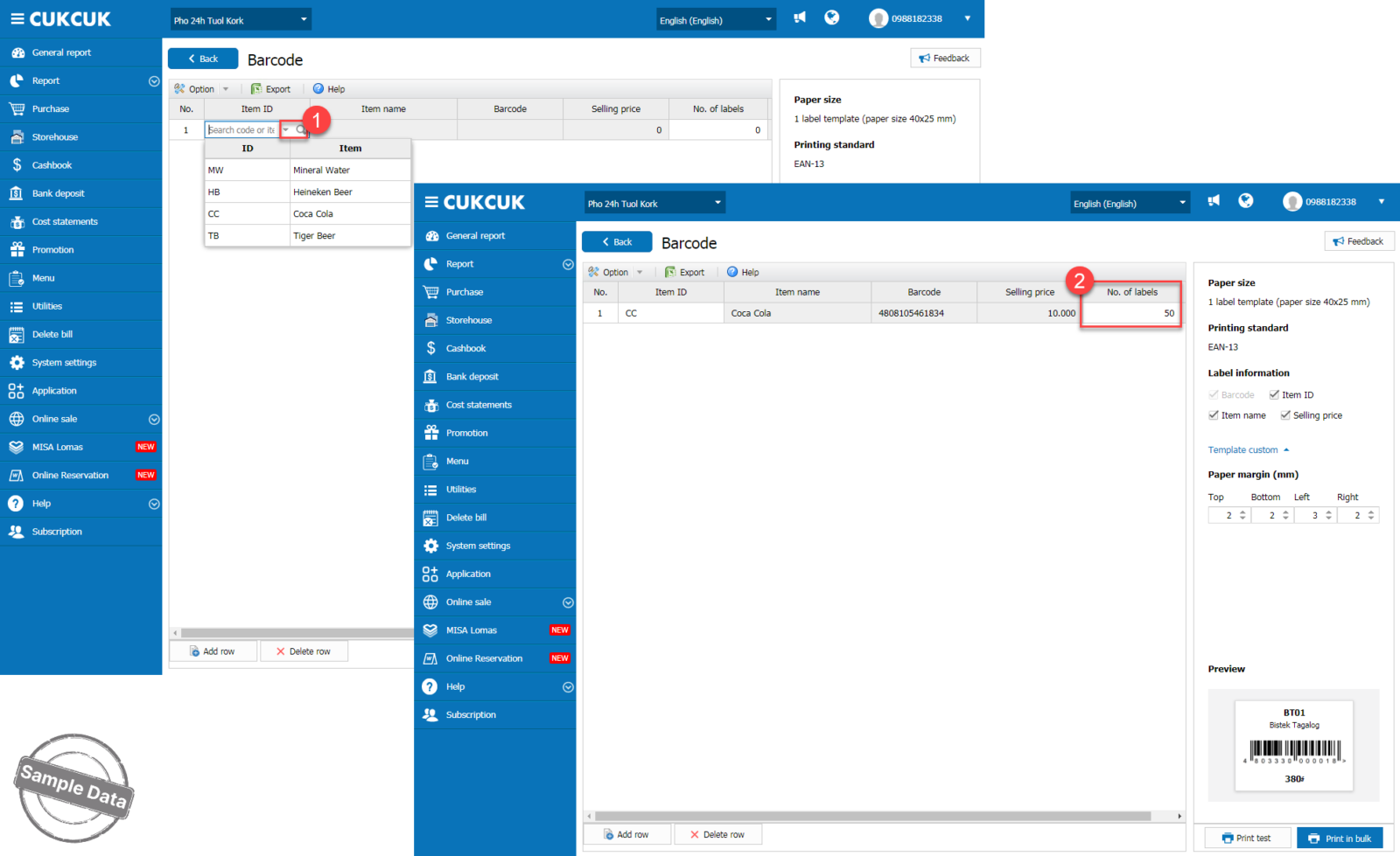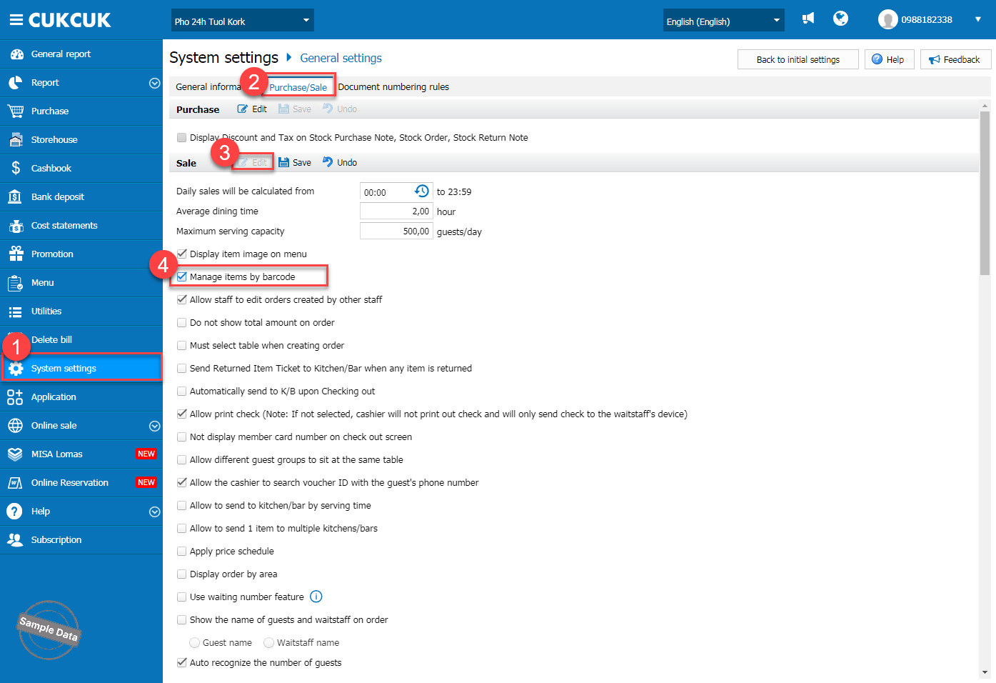 On the management page, go to System settings/General settings. On Purchase/Sale tab, click Edit on Sale part and check Manage items by barcode. Then, click Save.